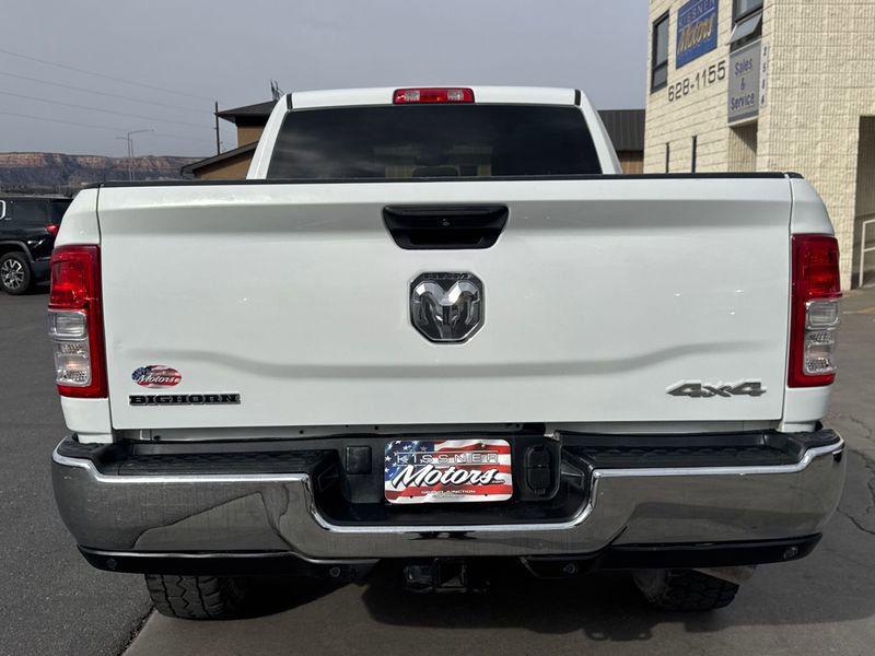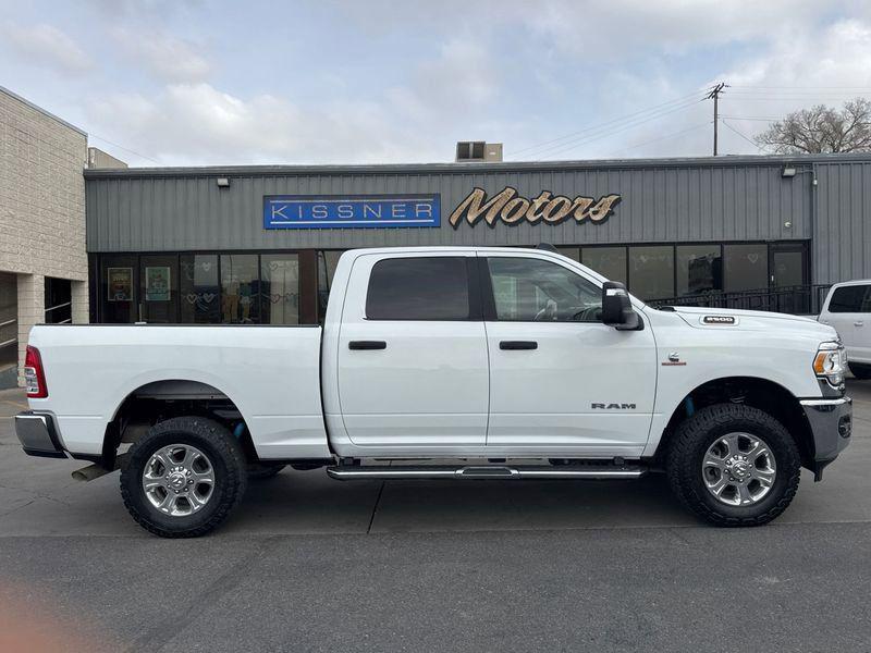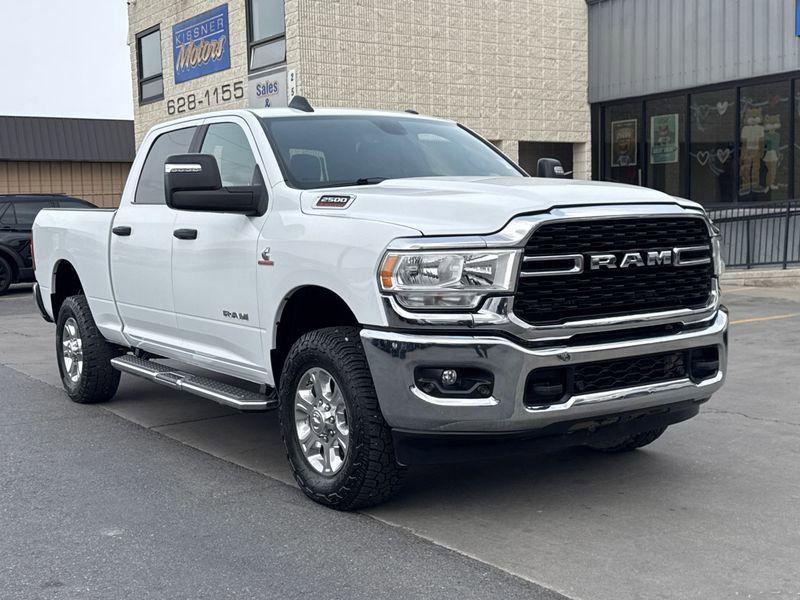 Bright White Clearcoat 2023 Ram 2500 Big Horn 4WD 6-Speed Automatic Cummins 6.7L I6 TurbodieselKissner Motors is a family owned dealership that has serviced the Western Slope for decades. The goal of the dealership is to take care of all of your transportation needs whether it is sales, service or parts.Cold Weather Group (Engine Block Heater and MOPAR Winter Front Grille Cover), Heavy Duty Snow Plow Prep Group (220 Amp Alternator), Level 1 Equipment Group (2 Way Rear Headrest Seat, 2nd Row In Floor Storage Bins, 4 Way Front Headrests, 40/20/40 Split Bench Seat, 4G LTE Wi-Fi Hot Spot, 8.4" Touchscreen Display, Apple CarPlay, Auto Power-Folding Mirrors, Big Horn IP Badge, Black Exterior Mirrors, Bluetooth Handsfree Phone & Audio, Connectivity - US/Canada, Dual Glove Boxes, Exterior Mirrors Courtesy Lamps, Exterior Mirrors w/Heating Element, Exterior Mirrors w/Supplemental Signals, Foam Bottle Insert (Door Trim Panel), Footwell Courtesy Lamp, For Details, Visit DriveUconnect.com, For More Info, Call 800-643-2112, Forward & Reverse Utility Lights, Front Armrest w/Cupholders, Front Center Seat Cushion Storage, Front Fog Lamps, Front Seat Back Map Pockets, Global Telematics Box Module (TBM), Glove Box Lamp, Google Android Auto, GPS Antenna Input, Integrated Center Stack Radio, Integrated Voice Command w/Bluetooth, Leather Wrapped Steering Wheel, Locking Lower Glove Box, Manual Adjust 4-Way Front Passenger Seat, Mirror Running Lights, Power 2-Way Driver Lumbar Adjust, Power Adjust 8-Way Driver Seat, Power Adjust Mirrors, Power Adjustable Convex Aux Mirrors, Power Heated Fold Telescope Mirrors, Power Telescoping Mirrors, Premium Cloth 40/20/40 Bench Seat, Radio: Uconnect 5 W w/8.4" Display, Rear 60/40 Folding Seat, Rear Dome w/On/Off Switch Lamp, Selectable Tire Fill Alert, SiriusXM Radio Service, SiriusXM Satellite Radio, Steering Wheel Mounted Audio Controls, and Storage Tray), Off Road Package (Front Performance Tuned Shock Absorbers, Hill Descent Control, Rear Performance Tuned Shock Absorbers, and Tow Hooks), Quick Order Package 2HZ Big Horn, 3.73 Axle Ratio, 4-Wheel Disc Brakes, 6 Speakers, ABS brakes, Active Noise Control System, Air Conditioning, Alloy wheels, Anti-Spin Differential Rear Axle, Auto-dimming Rear-View mirror, Brake assist, Bumpers: chrome, Center Hub, Center Stack Storage Drawer, Chrome Flat Cab-Length Side Steps, Cloth 40/20/40 Bench Seat, Compass, Delay-off headlights, Driver door bin, Dual front impact airbags, Dual front side impact airbags, Electronic Stability Control, Electronically Controlled Throttle, Emergency communication system: SiriusXM Guardian, Front anti-roll bar, Front Center Armrest w/Storage, Front License Plate Bracket, Front reading lights, Fully automatic headlights, Heated door mirrors, Illuminated entry, Low tire pressure warning, Manual Adjust 4-Way Driver Seat, MOPAR Spray In Bedliner, Occupant sensing airbag, Outside temperature display, Overhead airbag, Overhead console, Panic alarm, ParkSense Front/Rear Park Assist System, ParkView Rear Back-Up Camera, Passenger door bin, Passenger vanity mirror, Power door mirrors, Power steering, Power windows, Radio data system, Radio: Uconnect 3 w/5" Display, Rear anti-roll bar, Rear Backup Alarm, Rear Folding Seat, Rear seat center armrest, Rear step bumper, Rear Window Defroster, Remote keyless entry, Speed control, Tachometer, Tilt steering wheel, Tip Start, Traction control, Trip computer, Turn signal indicator mirrors, Variably intermittent wipers, Voltmeter, and Wheels: 18" x 8.0" Polished AluminuM.